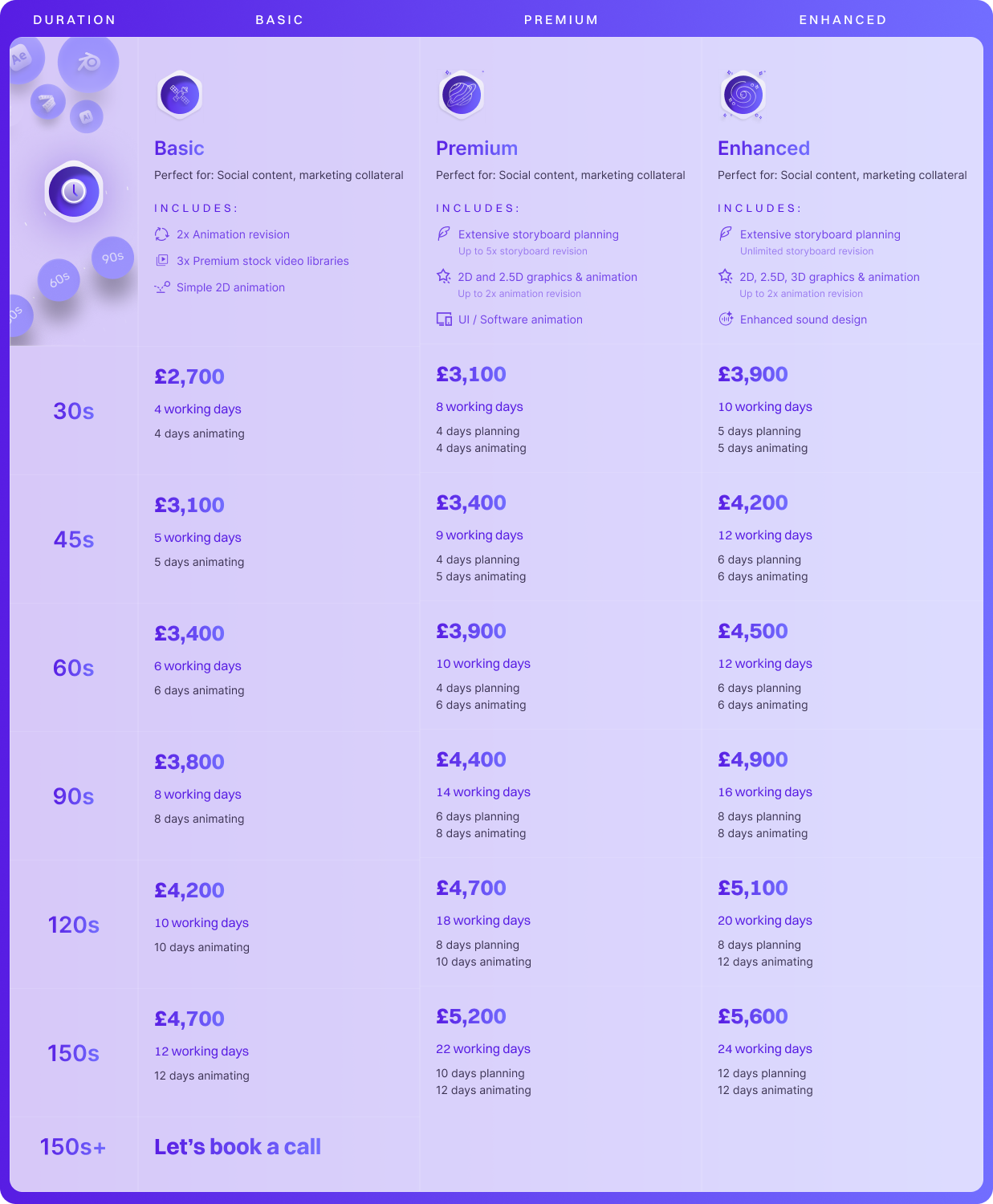 This table gives a clear breakdown of how our pricing works across three package tiers: Basic, Premium, and Enhanced. Each tier is designed for different needs, whether a client wants simple motion graphics, a more polished or even 2.5D animation, or a fully crafted animation with advanced visuals and sound design, or even 3D animated video.